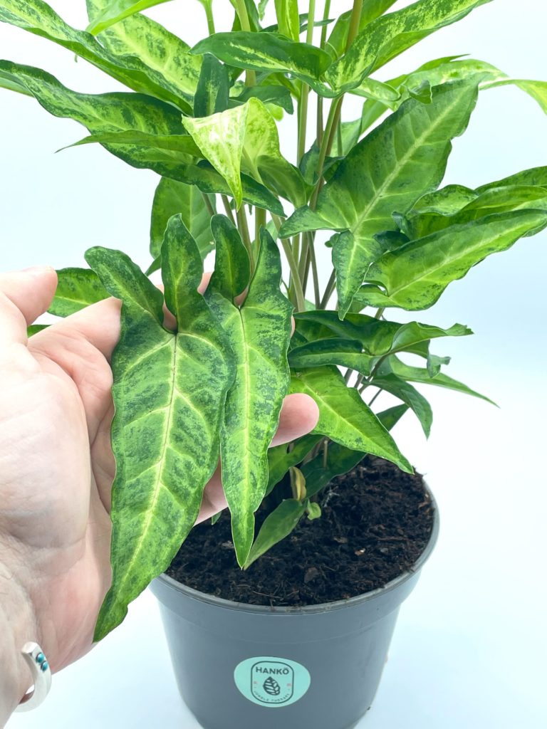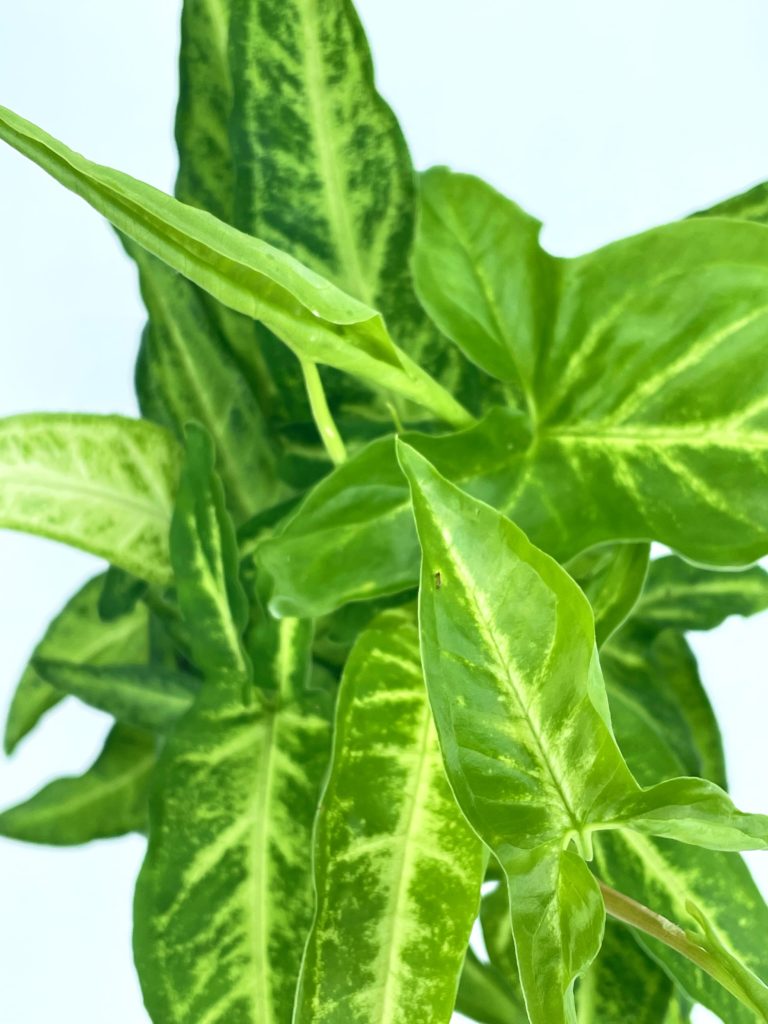 Le Syngonium Podophyllum ou encore Patte-d’oie est une plante grimpante ou retombante pouvant atteindre 2m en pot.