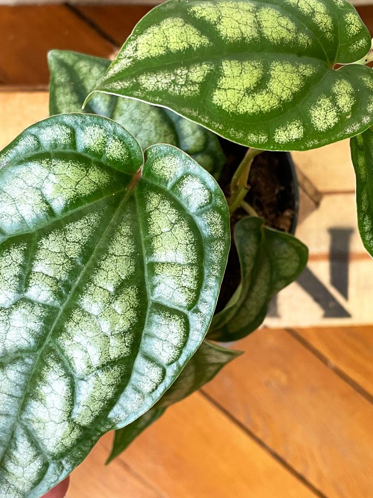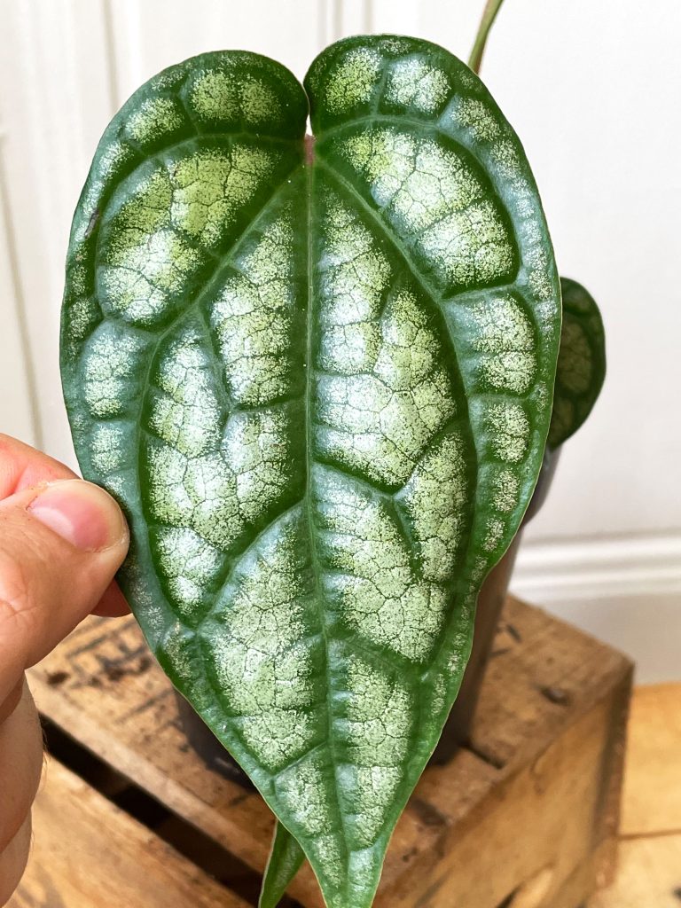 Ses feuilles magnifiquement en forme de cœur ont un éclat argenté/métallique. Elle a une veine claire d’un vert profond, mais les tiges sont doucement velues quand elles sont jeunes, et ne deviennent plus striées et plus profondes que lorsque la plante commence à mûrir.